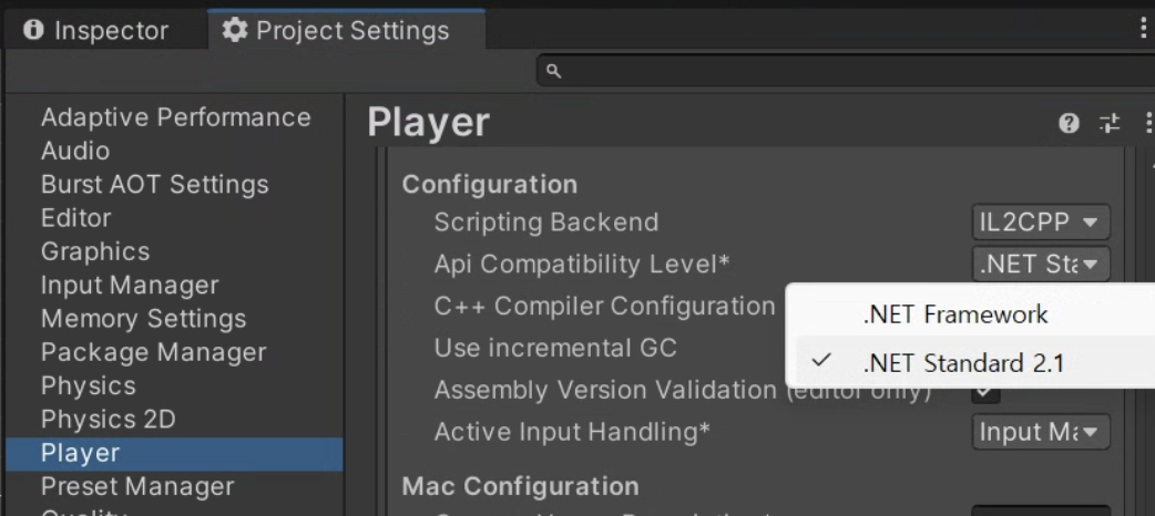 유니티 프로젝트 빌드 설정에서Api Compatibility Level을 .NET Standard 2.1 이상으로 설정해주세요.